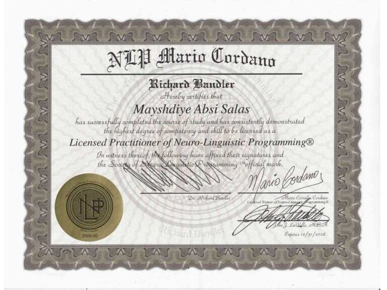 Una vez que complete con éxito la capacitación de Practitioner de PNL, recibirá su Certificado de PNL, Licensed NLP Practitioner, firmado a puño y letra por el Dr. Richard Bandler; John La Valle, Presidente de la Sociedad de PNL y Mario Corrales Cordano, Trainer Oficial.